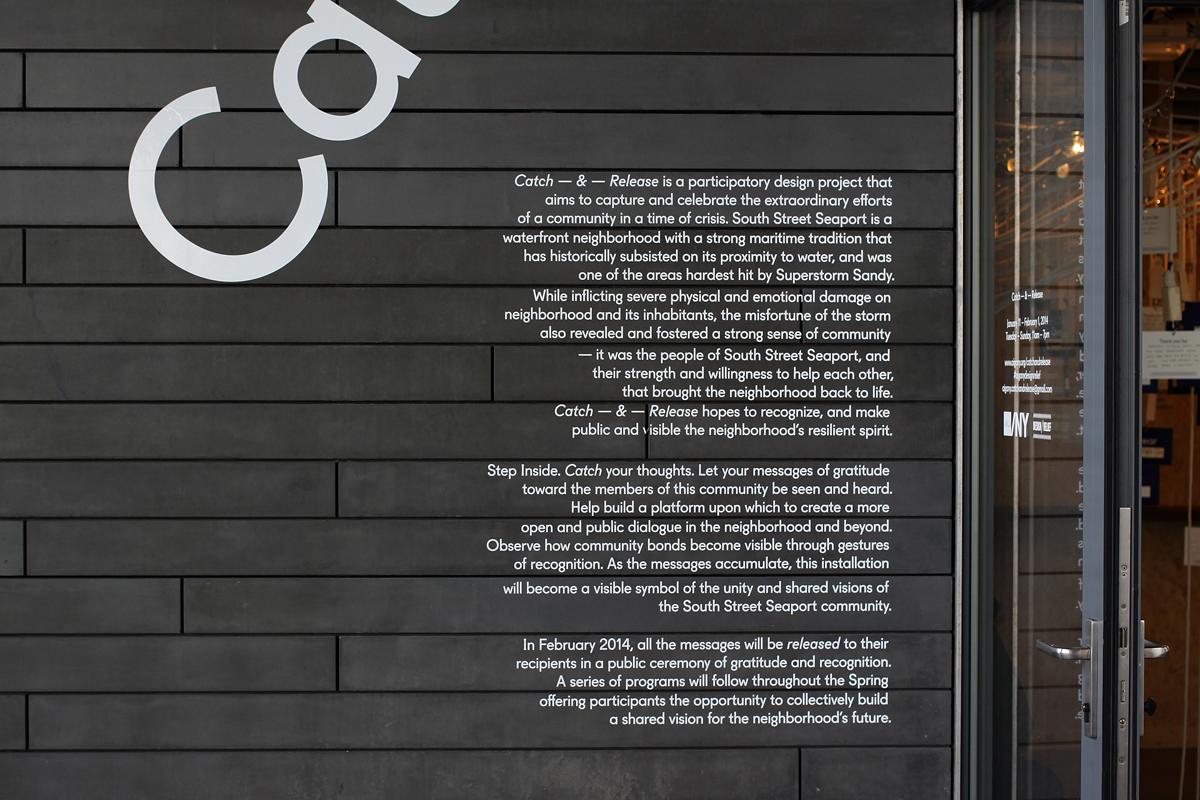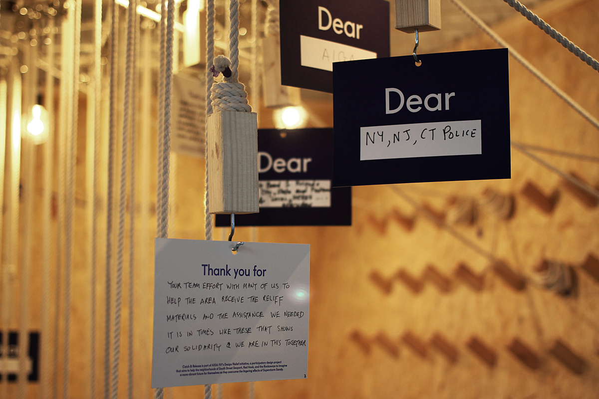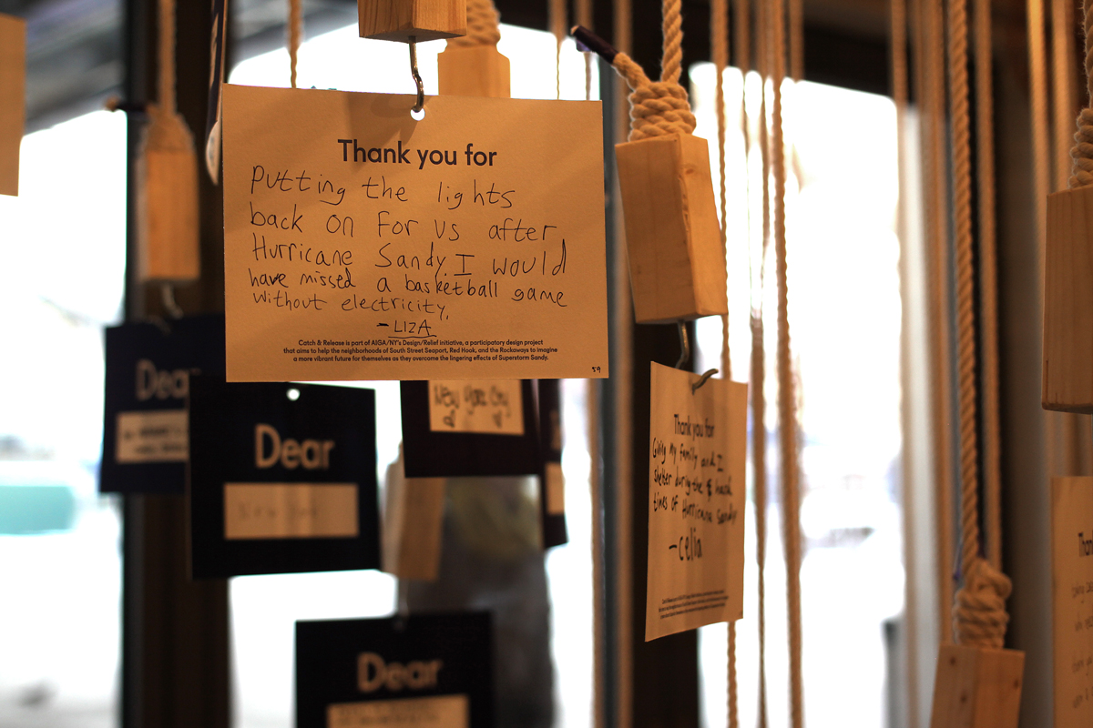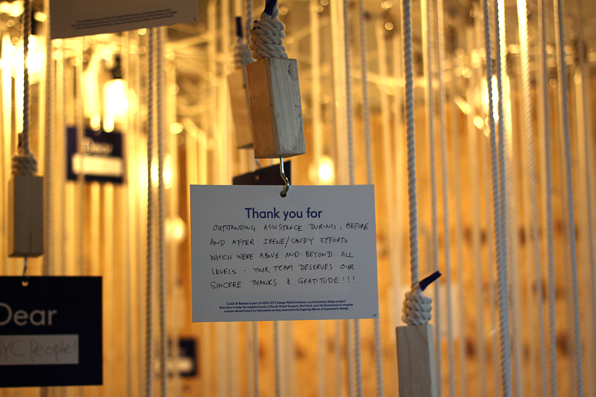 Catch — & — Release is part of AIGA/NY’s Design/Relief initiative, a participatory design project that aims to help the neighborhoods of South Street Seaport, Red Hook, and the Rockaways imagine a more vibrant future for themselves as they overcome the lingering effects of Superstorm Sandy. This special project of the New York chapter of AIGA explores the potential of design in defining and expanding creative placemaking to positively transform communities.