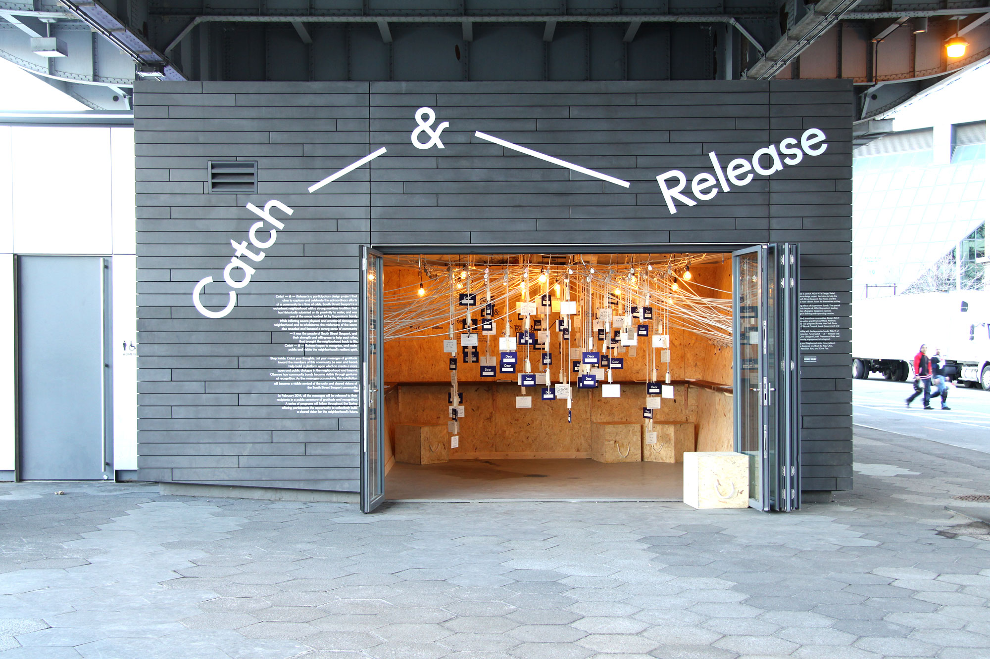 Catch — & — Release is a participatory design project in South Street Seaport that unearths hidden and forgotten aspects of the neighborhood’s rich history and culture. As the birthplace of maritime New York City, South Street Seaport holds extraordinary cultural assets that have been overlooked while going through generations of economic and environmental changes. By animating inactive spaces with cultural activities featuring recent and historical local lore, Catch — & — Release deepens a sense of place and community for both neighborhood inhabitants and visitors.
